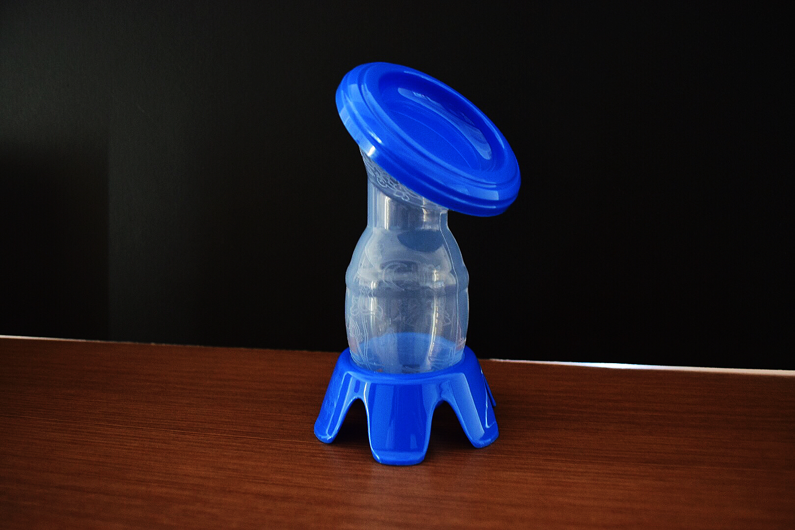 Step 3: Lightly squeeze the lower part of the breast pump breastmilk collector and place the opening to your breast.
